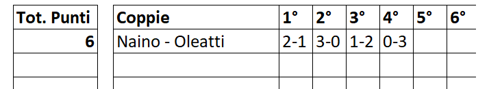 1° Partita: la squadra di Naino - Oleatti vince 2-1 totalizzando 2 punti